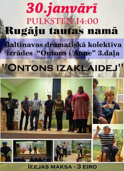 30. janvarī 14.00 Ruguoju tautys nomā tiks ruodeita Baļtinovys dramatiskuo kolektiva “Palādas” komedejis “Ontans i Anne” 3. daļa “Ontans izaklaidej”. Sovukuort 19.00 kolektivs gasteis Saļņovys kulturys nomā ar Ontana i Annis pīdzeivuojumu 4. daļu “Ontana tragedeja”.