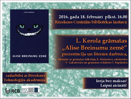 18. februarī 16.00 Rēzeknis Centraluos bibliotekys laseitovā (3. stuovā, Atbreivuošonys alejā 81) nūtiks L. Kerola gruomotys “Alise Breinumu zemē” prezentaceja i literaruo darbneica. Pasuokumā varēs satikt gruomotys tulkuotuoju Eviku Muiznieci, rakstnīku Valentinu Lukaševiču i gruomotys redaktori Ilgu Šuplinsku.