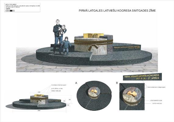 Veidojūt pīminis vītu, meta autori raudzeja atspīgeļuot i vizuali apzeimēt Latgolys kongresa nūzeimi Latvejis vaļsts izveidē viesturiskā kontekstā. Pīminekļa granita pamats atveiduots riņdžveida pakuopīņu veidā, kas simboliski stuosta par laika i viesturiskū procesu pyrma ituos nūzeimeiguos nūtikšonys. Pīminekļa centrys konceptuali raksturoj PLLK nūzeimeiguokuos idejis, ka Latgolys, Vydzemis i Kūrzemis latvīši ir vīna tauta i Latgolai juoapsavīnoj ar puorejim tūpūšuos Latvejis vaļsts nūvodim vīnā zemē. Centralais cilindriskais apjūms veidojās nu treis tonalitatē i fakturā dažaidim koltim laukakminim, kurūs kūpā satur tautyskuo jūsta kai myusu kūpeiguos ideņtitatis simbols. Latvejis silueta telpiskais apjūms centrā simbolizej, ka tik kūpā ituos treis vīneibys veidoj myusu vaļsti.