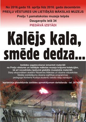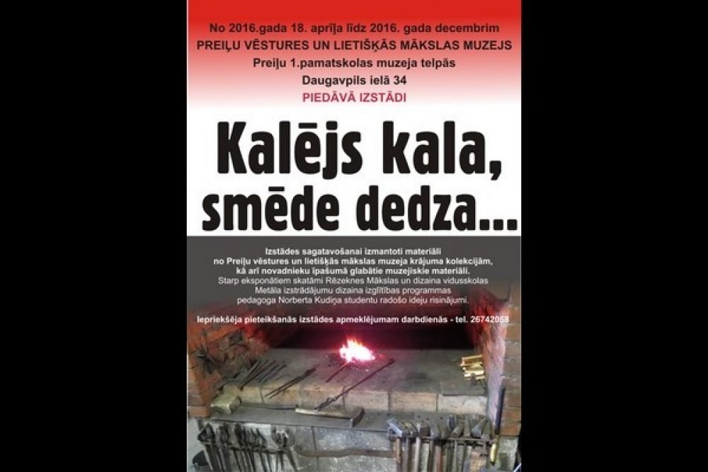 Da decembra Preiļu 1. pamatškolys muzejā (Daugovpiļs īla 34) apsaverama Preiļu viesturis i lītiškuos muokslys muzeja kruojuma izstuode “Kalējs kala, smēde dedza…”, informej muzeja puorstuove Silvija Ivanovska.