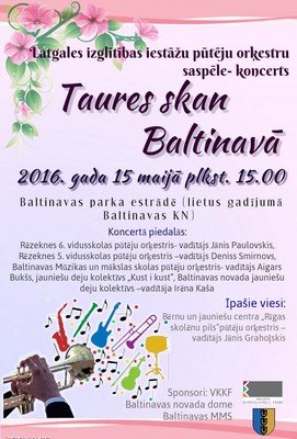 15. majā 15.00 Baļtinovys parka estradē (leita gadīnī Baļtinovys KN) nūtiks Latgolys izgleiteibys īstuožu pyutieju orkestru saspēle – koncerts “Taures skan Baltinavā”.