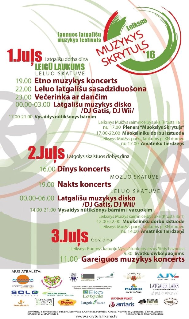 Daugovpiļs nūvoda Leiksnā nu 1. da 3. juļa jau sastū reizi nūtiks leluokais jaunuos latgalīšu muzykys festivals “Muzykys Skrytuļs‟, salosūt kūpā muzikus, kurī vysaidūs žanrūs roda dzīsmis latgaliski, informej Leiksnys pogosta Kulturys noma vadeituoja Sanita Pinupe.