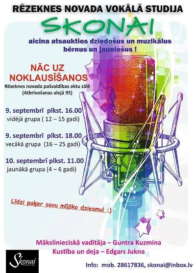 Septembra suokuos iz nūsaklauseišonu dzīdūšus bārnus i jaunīšus aicynoj Rēzeknis nūvoda vokaluo studeja “Skonai”, informej vokaluos studejis muokslinīciskuo vadeituoja Guntra Kuzmina.