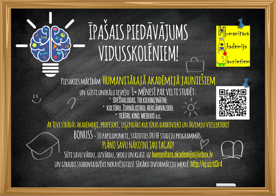 Vydsškolāni teik aicynuoti īsasaisteit Daugovpiļs Universitatis Humanitaruos fakultatis jaunīšu interešu izgleiteibys školys “Humanitārā akadēmija jauniešiem” (HAJ) aktivitatēs, kas suoksīs 8. oktobrī.