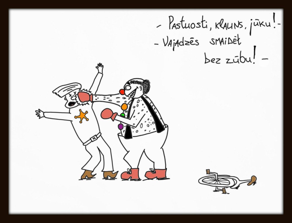 Cylvāks jau taids ir, ka pīraksteitu tekstu cytaiž uztver, a, ka tu esi koč kū pīzeimuojs kluotyn, to jau juodūmoj, deļkam tī tai, a deļkam itai. Munim draugim muokslinīkim pateik kartinka, kurā klaunam prosa pastuosteit jūku i jis atbiļd: “Vajadzēs smaideit bez zūbu!”