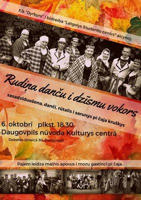 6. oktobrī 18.30 Daugovpiļs nūvoda kulturys centrā nūtiks bīdreibys “Latgolys Studentu centrs” (LgSC) Daugovpiļs biroja i folklorys kūpys “Dyrbyni” reikuotais pasuokums “Rudiņa danču i dzīsmu vokors”, informej LgSC puorstuove Gunta Nagle.