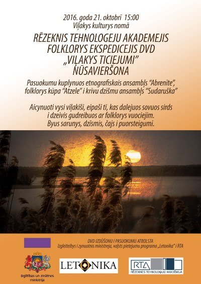 21. oktobrī 15.00 Viļakys kulturys nomā varēs nūsavērt Rēzeknis Tehnologeju akademejis folklorys ekspedicejis DVD “Viļakys ticiejumi”, viestej informaceja augstškolys sātyslopā.