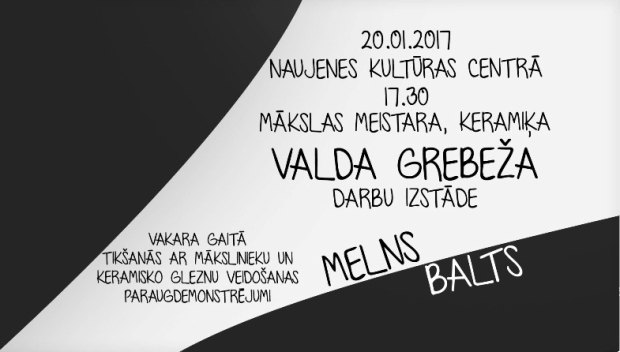 Naujinis Kulturys centrā 20. janvarī 17.30 nūtiks Valda Grebeža izstuodis “Melns, Balts” atkluošona, viestej informaceja Daugovpiļs nūvoda sātyslopā.