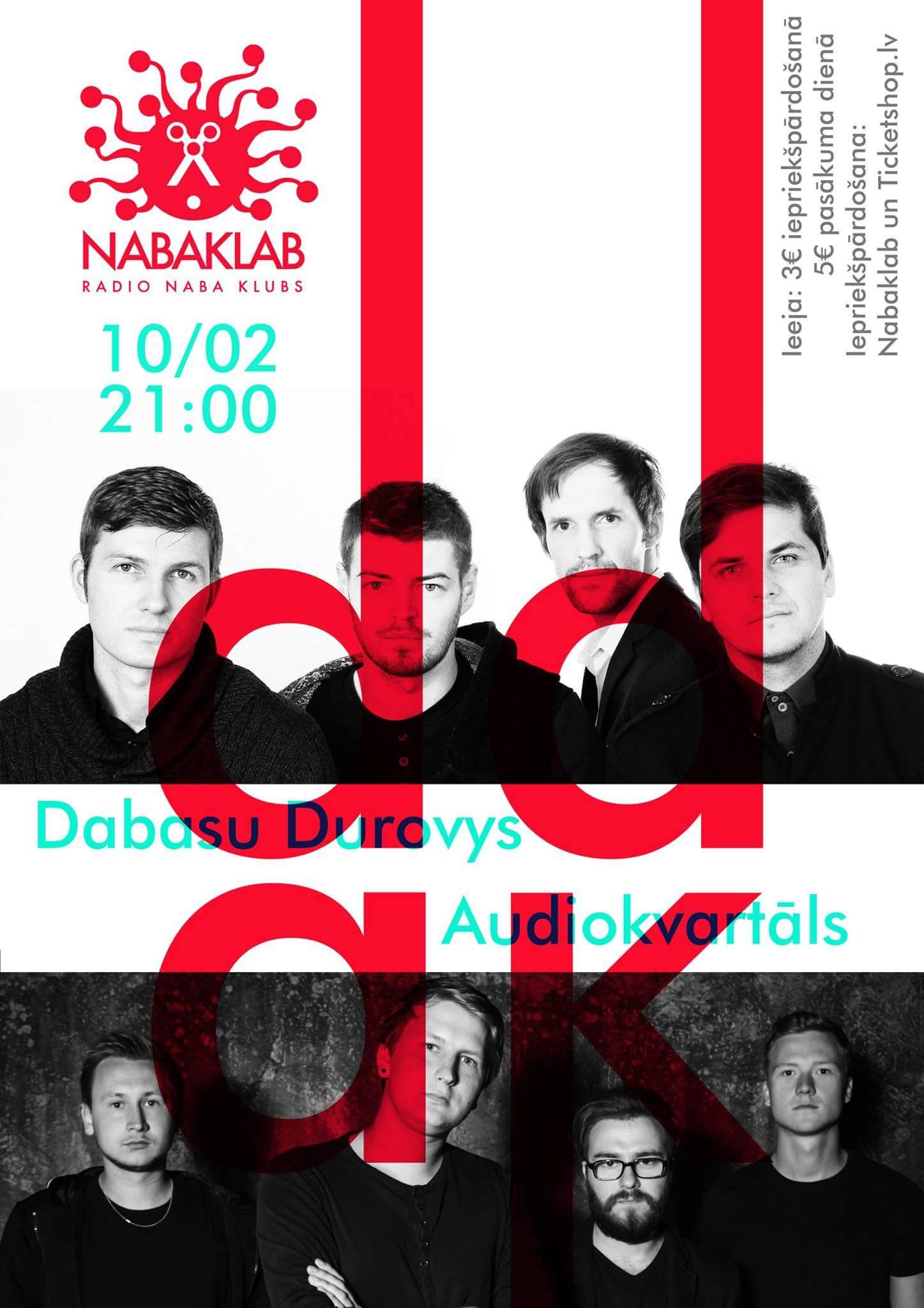Šudiņ 21.00 Reigā, NABAKLAB nūtiks grupu “Dabasu Durovys” i “Audiokvartāls” koncerts.