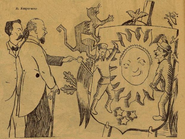 7. att. K. Kasparsona zeimātuo Latvejis Republikys gierbūņa karikatura. (Olūts: Kasparsons K. Satv. Sap. Ģerboņa Komisijai. Svari. 1921. g 28. janvars (Nr. 7). 50. lpp.)