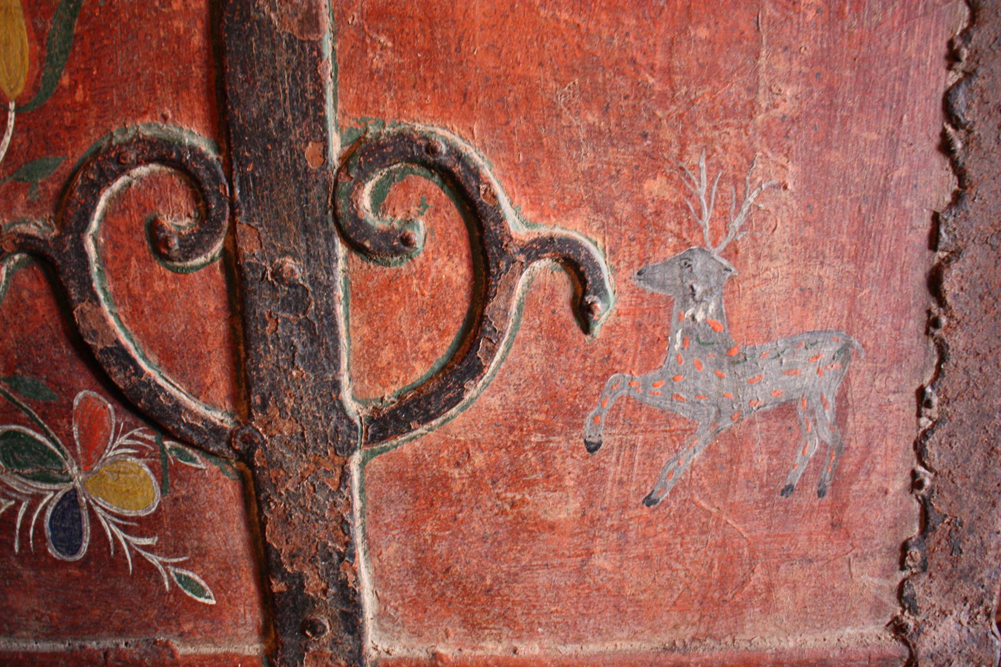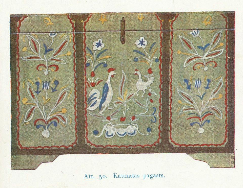 Skreinis gleznuojums – gaiļa i vystys puors. 19. g.s. beigys. Kaunatys pogosts, Leini, Maculeviča sāta. Atrūnams Latvejis Etnografiskajā breivdobys muzejā.