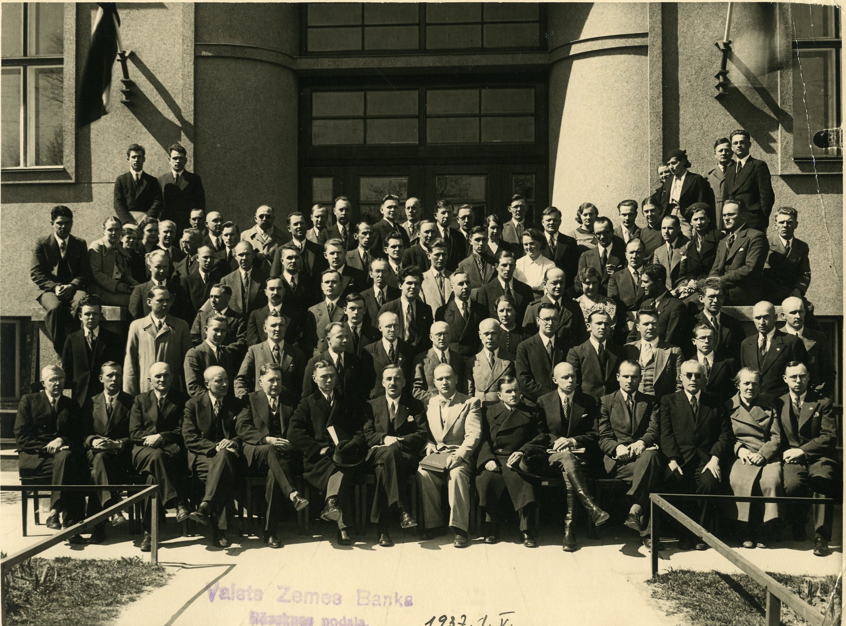 Vaļsts zemis bankys Rēzeknis nūdalis darbinīki pi bankys ākas. Pyrmajā ryndā septeitais nu kreisuos pusis – bankys puorvaļdnīks Jezups Laurinovičs, 1937. g. 1. maijs.