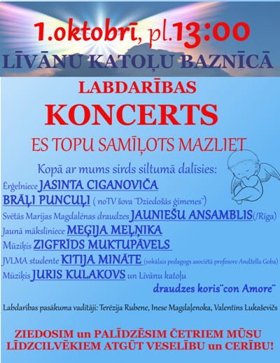 1. oktobrī 13.00 Leivuona katuoļu bazneicā nūtiks labdareibys koncerts “Es topu samīļots mazliet”.