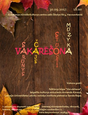 Sastdiņ 30. septembrī, sešuos stuņdēs vokorā Kulturys centra zalā (Školys īlā 5, Vacvuorkovā) vysi aicynuoti iz vakariešonu. Vokora gaitā latgalīšu kulturys entuziasts Armands Kūceņš pastuosteis par Sibirī dzeivojūšajim vuorkavīšim, kuri 1899. godā aizbrauce dzeivuot iz Tomskys apgobola Kryvašeinys rajonu. Ekspedicejis laikā ir pīfiļmāti video i sataiseitys biļdis, kurys vokorā tiks vysim paruodātys. Īspiejams, ka Sibirī dzeivojūšī latgalīši ar pavuordem Dambeits, Dolgais, Gavars, Lozdāns, Onckuļs, Plyuda, Pluoņs, Pūdžs, Rusiņs, Spūļs, Strods, Šnepsts, Vaivods, Vonogs, Vuolonts i Zeile ir niulinejūs Vuorkovys nūvoda dzeivuotuoju rodi.