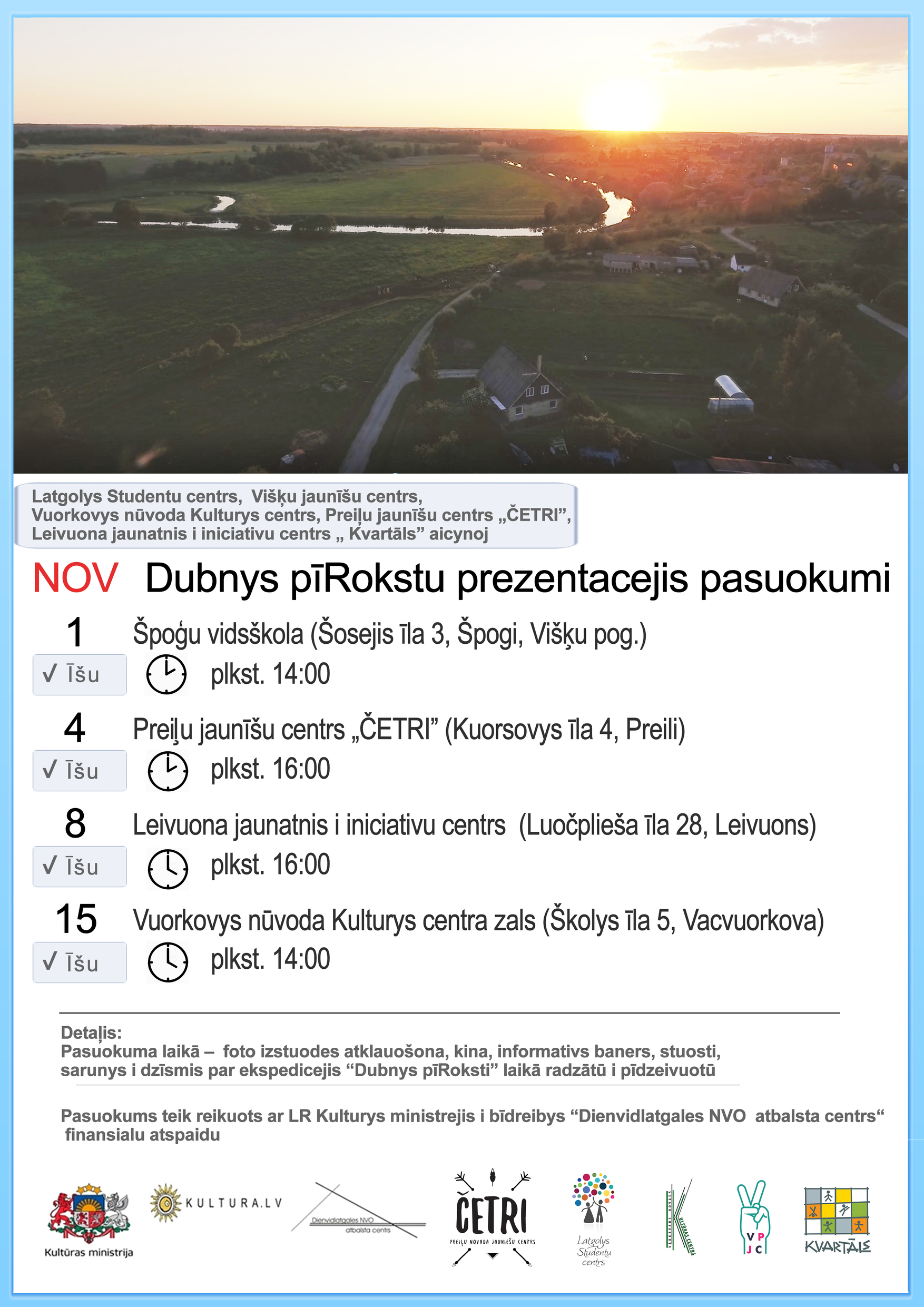 Bīdreiba “Latgolys Studentu centrs” sevkuru aicynoj iz sasatikšonu ar projekta “Dubnys pīRoksti” dalinīkim 1. novembrī 14.00 Špogu vydsškolā, 4. novembrī 16.00 Preiļu jaunīšu centra “Četri” telpuos, 8. novembrī 18.00 Leivuona jaunatnis i iniciativu centrā “Kvartāls”, kai ari 15. novembrī Vuorkovys nūvoda Kulturys centrā, kur tiks prezentāta projekta laikā izveiduotuo kina, fotoizstuode i karte.