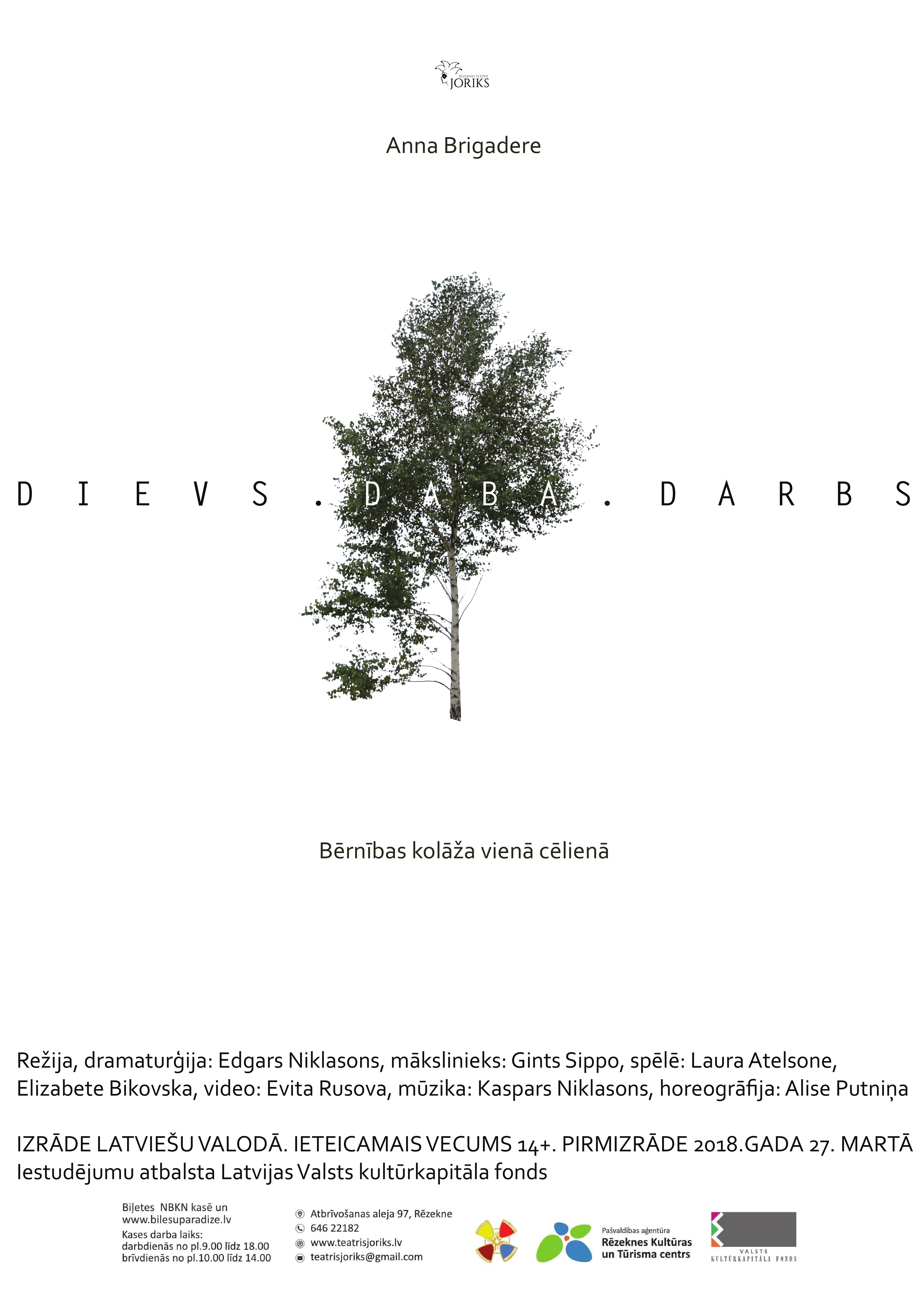 Rēzeknis teatrī “Joriks” īstudāta vīncielīņa bierneibys kolaža piec Annys Brigaderis autobiografiskuo romana motivim – “Dievs. Daba. Darbs”. Pyrmizruode nūtiks 27.martā 18.00 stuņdēs.