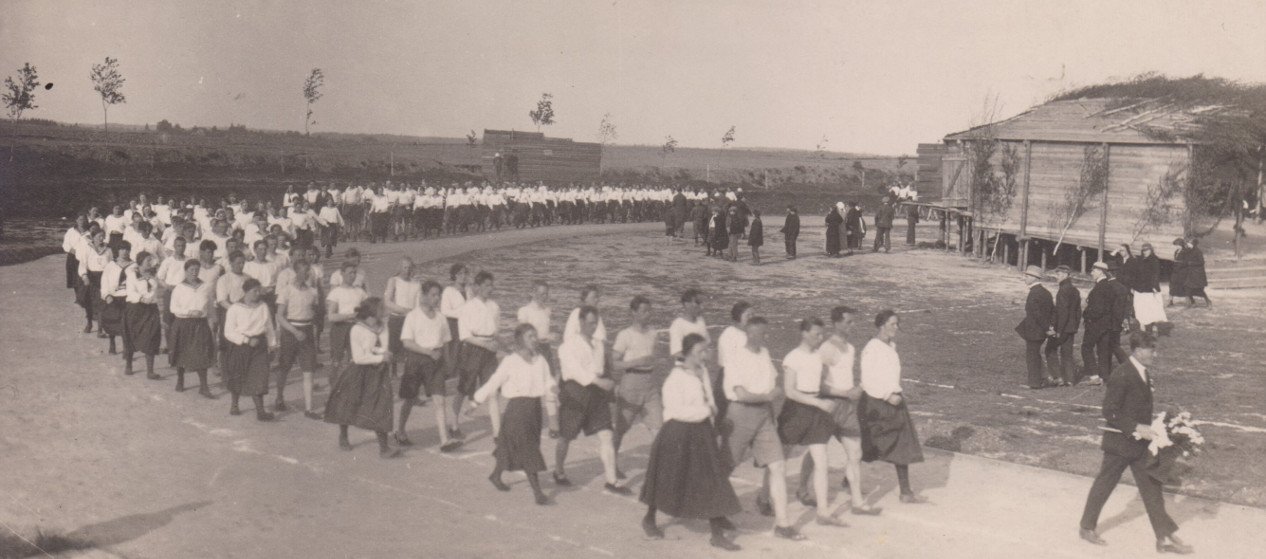 Svineigs Sporta svātku dalinīku guojīņs Rēzeknis sporta laukumā, 1925.g. 18. majs. Karteite: Latgolys Kulturviesturis muzeja kruojums.