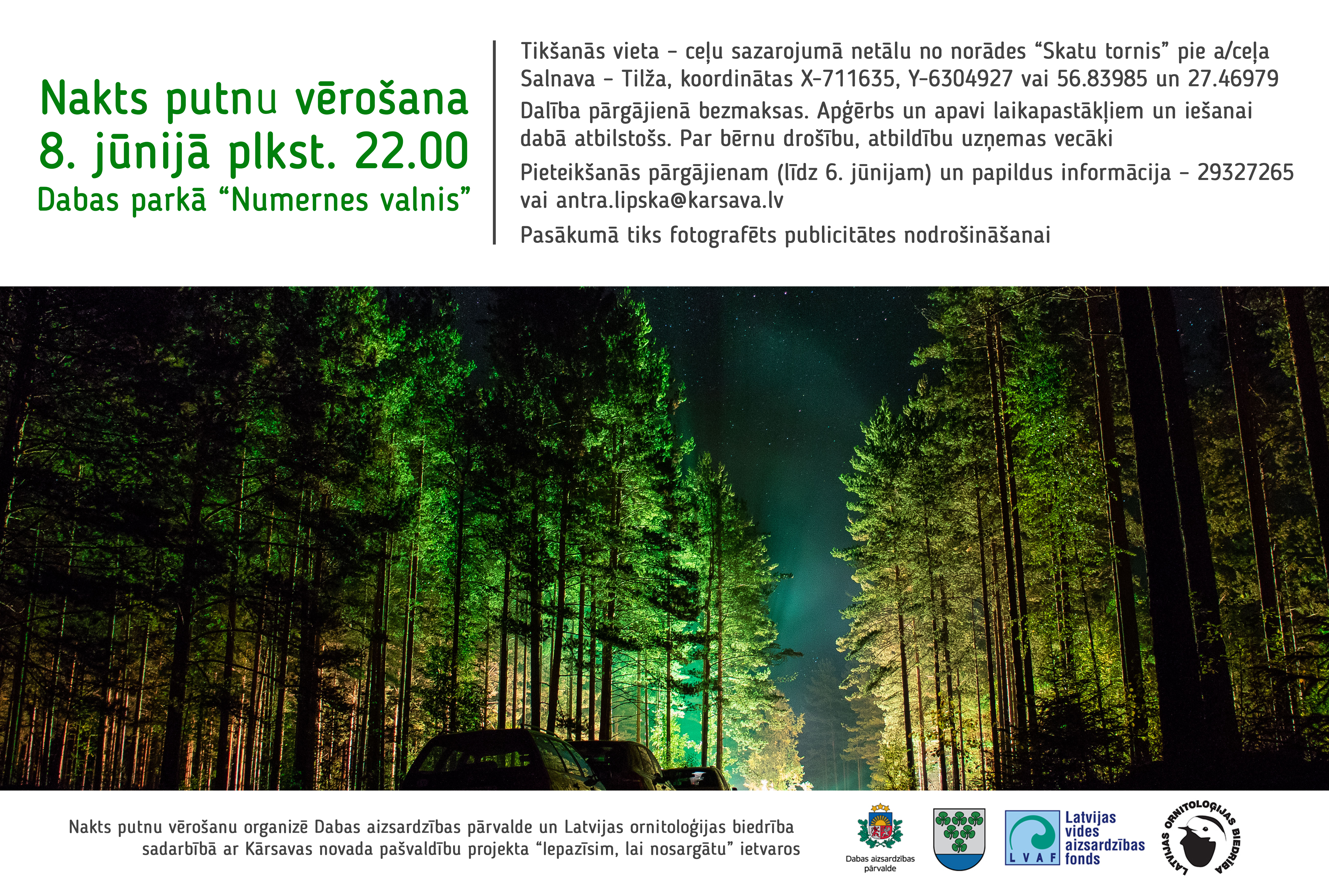 Ja pīktdinis vokoru gribīs pavadeit svaigā gaisā i tyvuok pi dobys, tod ir īspieja nu 22.00 leidz 1.00 pīsadaleit nakts putynu vāruošonā i puorguojīnī dobys parkā “Numernes valnis”. Ar putnu dzeivi naktī īpazeistynuos Dobys aizsardzeibys puorvaļdis specialists Dagnis Vasiļevskis.