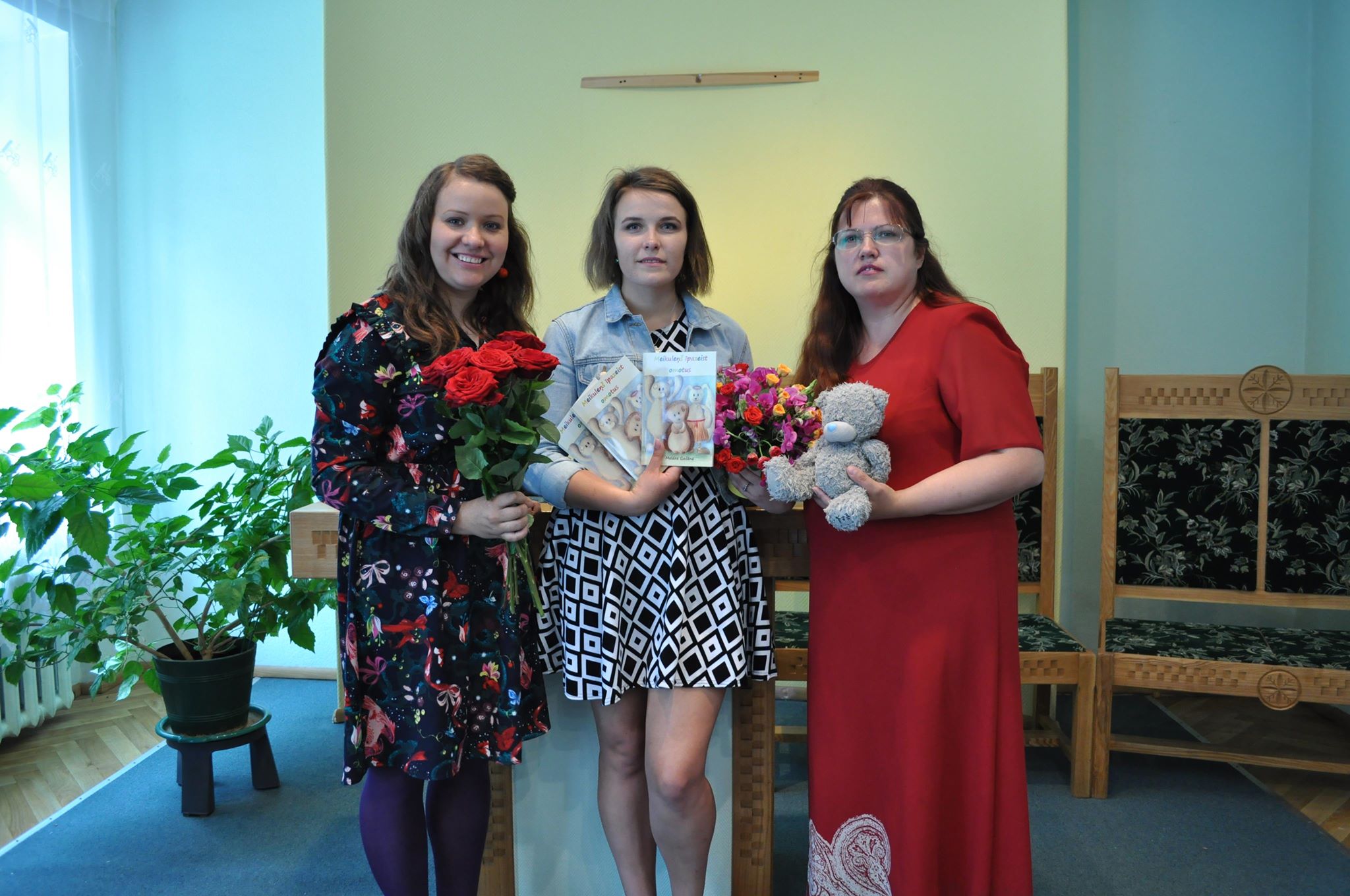 Dagnija Dudarjonoka, Līga Munda i Meldra gruomotys “Meikuleņš īpazeist omotus” prezentacejā.