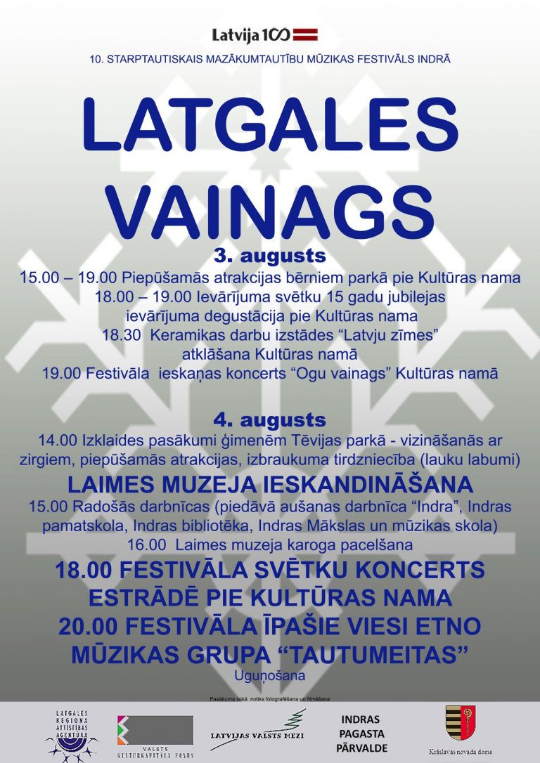 Svynūt Latvejis vaļsts symtgadi Kruoslovys nūvoda Indrā 3. i 4. augustā nūtiks storptautiskais mozuokumtauteibu festivals “Latgales vainags”. Festivala eipašī gosti ir etno muzykys grupa “Tautumeitas”.