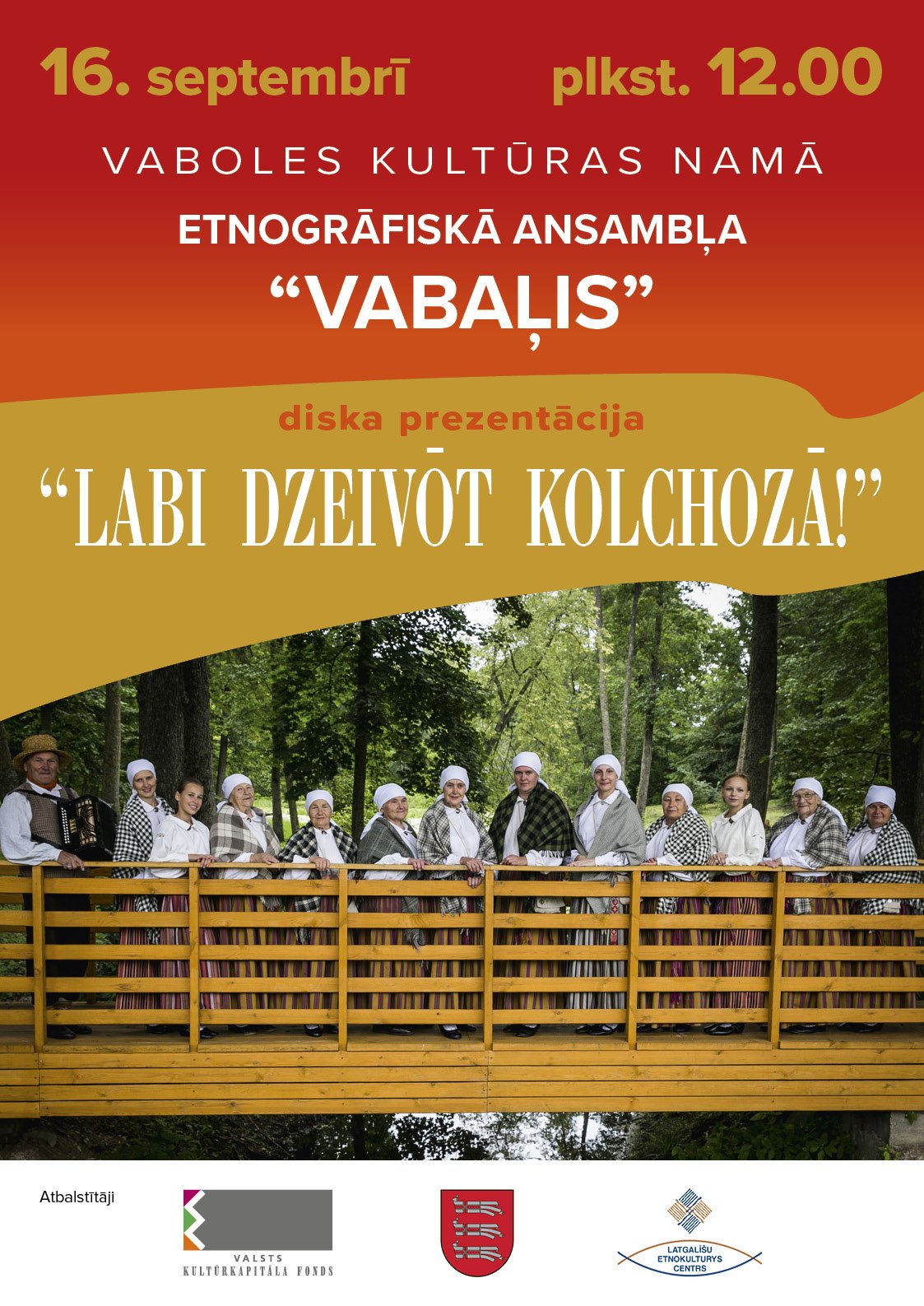 Daugovpiļs nūvoda etnografiskais ansamblis “Vabaļis” aicynoj iz sova trešuo albuma “Labi dzeivōt kolchozā!” prezentaceju, kas byus svātdiņ, 16. septembrī, 12.00 Vabalis kulturys nomā. Jaunajā albumā byus 12 dzīšmu, kuruos pīsaskar da ituo Latvejā moz pacaltai dzīšmu montuojuma daļai – kolhoza laikūs tautā dzīduotom dzīsmem.