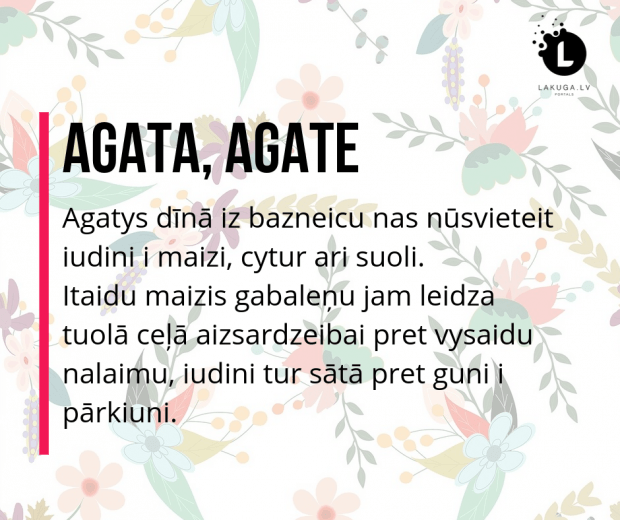 5. februarī Katuoļu bazneica svietej svātuos mūceklis Agatys dīnu, piec seneju tradiceju ticeigī nas iz bazneicu nūsvieteit iudini i maizi, cytur ari suoli. Itaidu maizis gabaleņu jam leidza tuolā ceļā aizsardzeibai pret vysaidu nalaimu, iudini tur sātā pret guni i pārkiuni. Sv. Agatu Sicilejā 3. g. s. mūceja ar gunī sakarseitom lyuškom i izruove jai kryuts. Kod cylvāki pi juos kopa lyudze aizsardzeibu nu vulkana izvyrduma, lavys guņs apsastuoja.