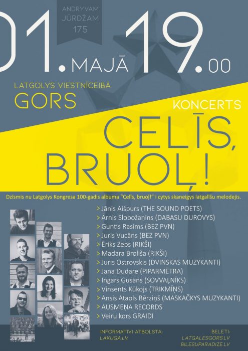 Latgolys viestnīceibā GORS 1. majā nūtiks koncerts “Celīs, bruoļ!”, kurymā izskanēs dzīsmis nu Latgolys kongresa symtgadis albuma “Celīs, bruoļ!” i cytys skaneigys latgalīšu melodejis. Tuos izpiļdeis gon jau labi zynomi, gon ari pavysam jauni, dažaidus muzykys stylus puorstuovūši muokslinīki. Koncerts ir eipašs veļtejums gruomotu raksteituoja Andryva Jūrdža pīmiņai, jam itūgod – 175.