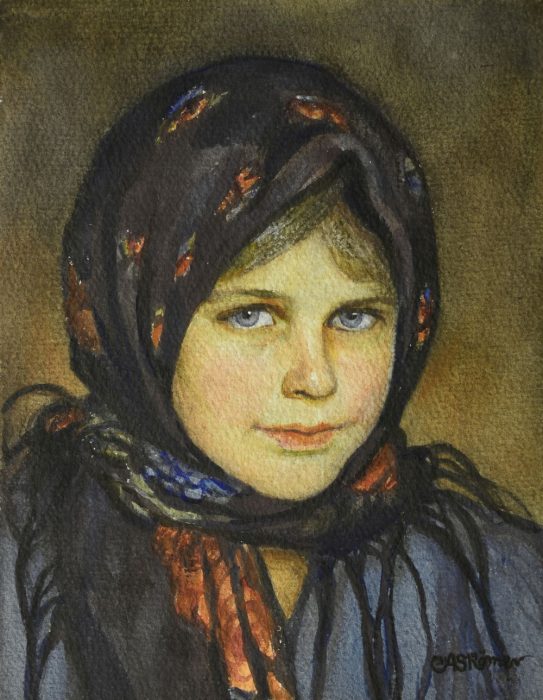 Portreta žanra dorbi A. Soltanis-Romeris izpiļdejumā ir izcyli cylvāku psihologiskuo raksturuojuma devieji. Muokslineica ir pratuse atrast eipašu kontaktu ar portretejamū – vīnolga, ci tī ir juos bārni, zemnīku meitinis, vītejī ci ari muokslineicys veirs. Gleznā “Vaņka Orlovs, staravers nu Bondaru” attāluots puiss kuorteigā vuškys kažukā pi cepļa ar samovaru. Dagūšys zylys acs i dzeivisprīca jaunaveigajā sejā tūreiz ir īdvasmuojušys akvarelisti. I vēļ vacuo aukleite Aņa Proveja pi tipiskys boltys lauku plitenis, kūka calma beņči i cepļa molā syldomim muola žbanim i lauku meitinis ružovim byudim kruosainūs skustūs.