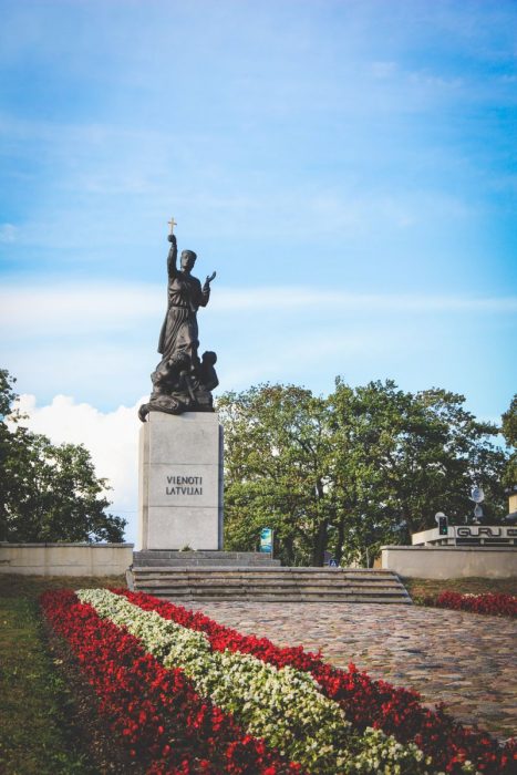 Bronzā koltū Latgolys Muoru – Latgolys Atbreivuošonys pīminekli “Vienoti Latvijai” – svineigi atkluoja 1939. g. 8. augustā Rēzeknē, dīmžāļ padūmu varys guoztū pīminekli daguoja atjaunuot i atkluot vēļreiz 1943. gods augustā i trešū reizi – 1992. gods augustā. Lai ari pīmineklis sastuov nu treju figuru, važu ruoviejs i lyugšonā īgrymušuo tautu meita ar ūzula lopu viertini “nateik pamaneiti”, a izcalta teik centraluo sīvītis figura ar kristeņu lobajā rūkā.