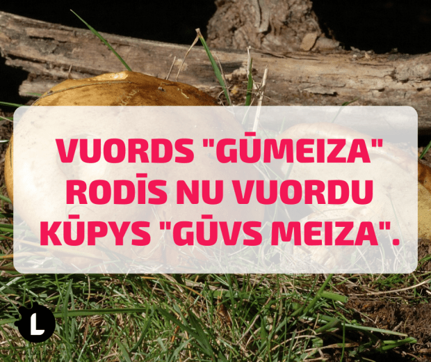 Vuords “gūmeiza” rodīs nu vuordu kūpys “gūvs meiza”, itū vuordu izlūksnēs attīcynoj i iz pļovys pučem, i iz vairuokom sienim, i puornastā nūzeimē tei ir ekspresiva neivojūša apsauka. Par gūmeizu teik saukta: 1) parostuo peipine (Leucanthemum vulgare); 2) teiruma iļzeite (Anthemis arvensis); 3) Suillus bovinus, agruok Boletus bovinus – govju sviestbeka; 4) Lactarius – rudmiese; 5) Agaricus – atmatene; 6) Tricholoma – pūkaine; 7) Suillus – sviesta beka; 8) Lactarius rufus – alksnene; 9) Paxillus involutus – kailā mietene; 10) naādamuos sieņs; 11) puornastā nūzeimē napateikams bezrakstura cylvāks.