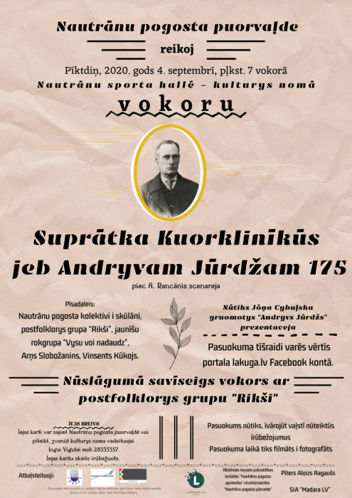 4. septembrī 19:00 stuņdēs Nautrānu sporta hallē-kulturys nomā (Rēzeknis nūvoda Rogovkā) nūtiks izcyluo nūvodnīka Andryva Jūrdža 175. jubilejai veļteits pasuokums “Suprātka Kuorklinīkūs jeb Andryvam Jūrdžam – 175”. Koncertuzvadums atkluos A. Jūrdža dzeivis interesantuokūs faktus i snēgs īskotu juo literarajā montuojumā.