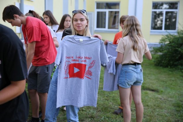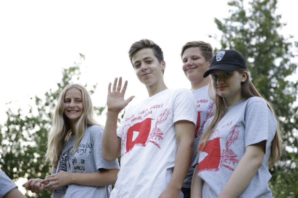 Pyrmajā apvuiceibu dīnā jaunīši sovstarpeji sasapazyna, veiduoja salīdātu komandu, izmontojūt dažaidys komandu veidojūšuos aktivitatis i grupu dorbus. Dīnys nūslāgumā, izmantojūt sītspīdis drukys tehniku, daleibnīki apdrukuoja sev t-kraklus ar Latgolā pazeistamuo muokslinīka Raibuo veiduotū dizainu. Tys ļuove jaunīšim vaira īpazeit muokslinīka dorbus i latgalīšu volūdu.
