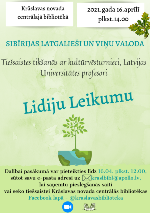16. aprelī 14.00 stuņdēs Kruoslovys nūvoda centralajā bibliotekā byus tīšsaistis sasatikšona “Sibīrijas latgalieši un viņu valoda” ar kulturviesturneicu, Latvejis Universitatis profesori Lideju Leikumu, viestej Kruoslovys nūvoda sātyslopa.
