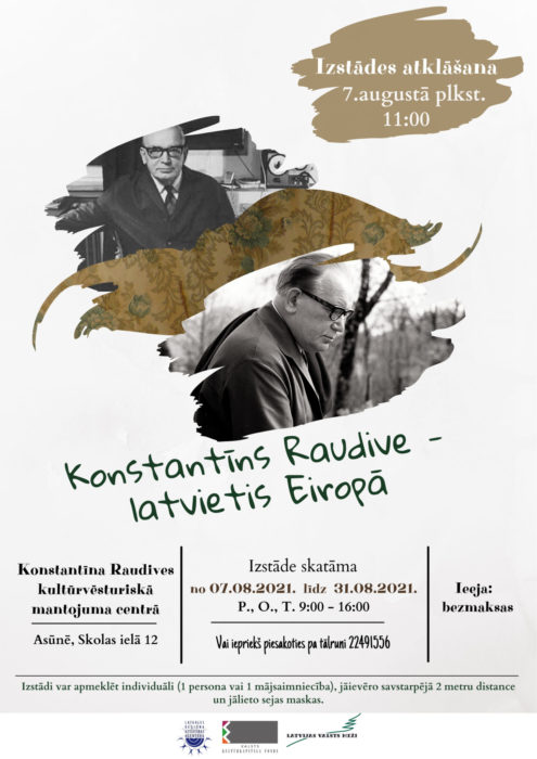 7. augustā 11. stuņdēs Kruoslovys nūvoda Osyunā, Školys īlā 12, Konstantina Raudivis kulturviesturiskuo montuojuma centrā, tiks atkluota izstuode “Konstantīns Raudive – latvietis Eiropā”, kas te byus apsaverama da 31. augusta, piec tam – Dagdā i Kruoslovā, informej Konstantina Raudivis kulturviesturiskuo montuojuma centra i ituos izstuodis projekta vadeituoja Laura Pauliņa.