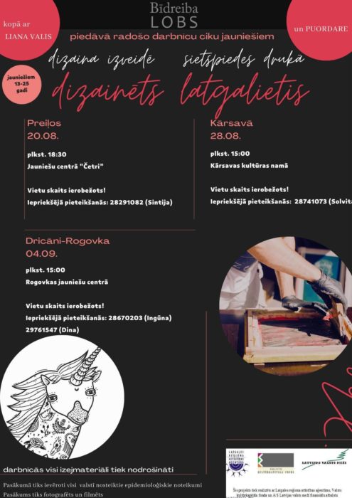 Bīdreiba “Lobs” kūpā ar uzjāmumu “Puordare” i zeimyna “Liana Valis” dybynuotuoju organizej rodūšuos darbneicys Latgolys jaunīšim – 20. augustā 18.30 stuņdēs Preiļūs, jaunīšu centrā “Četri”, 28. augustā Ludzys nūvoda Kuorsovys kulturys nomā i 4. septembrī Rēzeknis nūvoda Rogovkys jaunīšu centrā. Darbneicuos varēs izveiduot sovu latgalīša logo, kai ari īsavuiceit sītspīdis apdrukys pamatus i īvyngrynuot rūku sovu maiseņu apdrukavuošonā. Vītu skaits īrūbežuots, partū īprīškeja dasasaceišona.