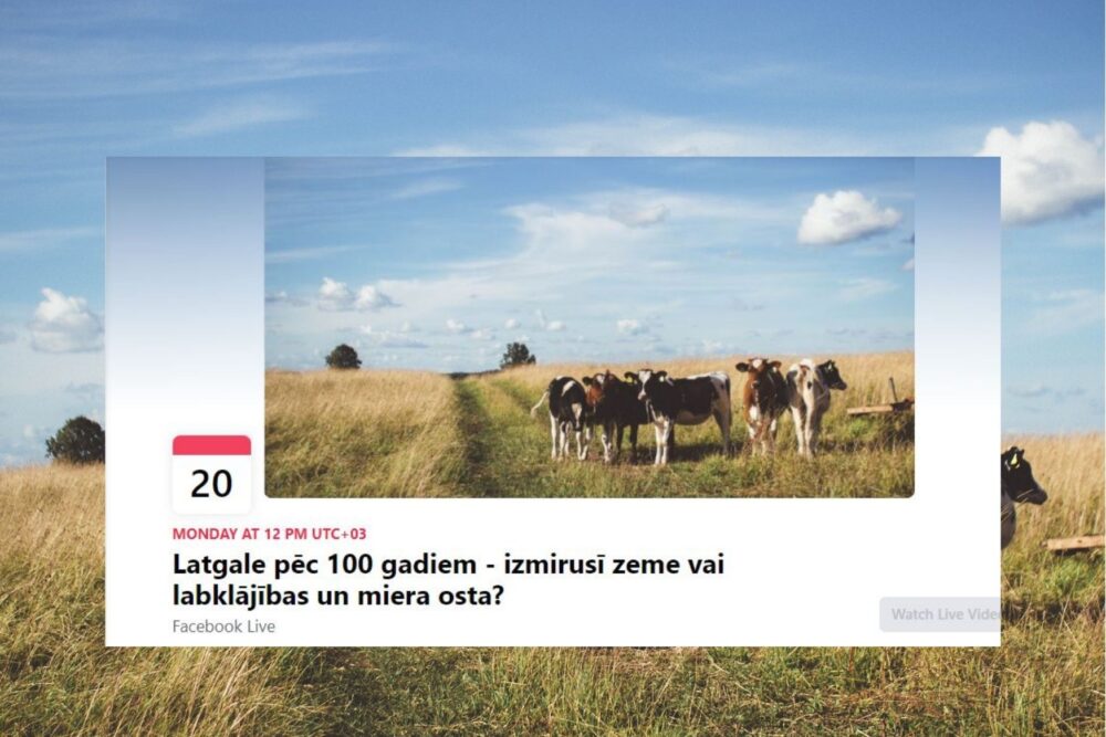 20. septembrī 12.00 stuņdēs “Facebook” tīšsaistē varēs nūsaklauseit diskuseju “Latgale pēc 100 gadiem – izmirusī zeme vai labklājības un miera osta”, kurā apsprīss Latgolys atīmūšūs laikus, izaicynuojumus, ar kurim sasaskar Latgolys īdzeivuotuoji, kai ari tū, kas ir juodora, lai Latgola byutu lobkluojeiga vīta, kurā dzeivuot i iz kuru atsagrīzt.