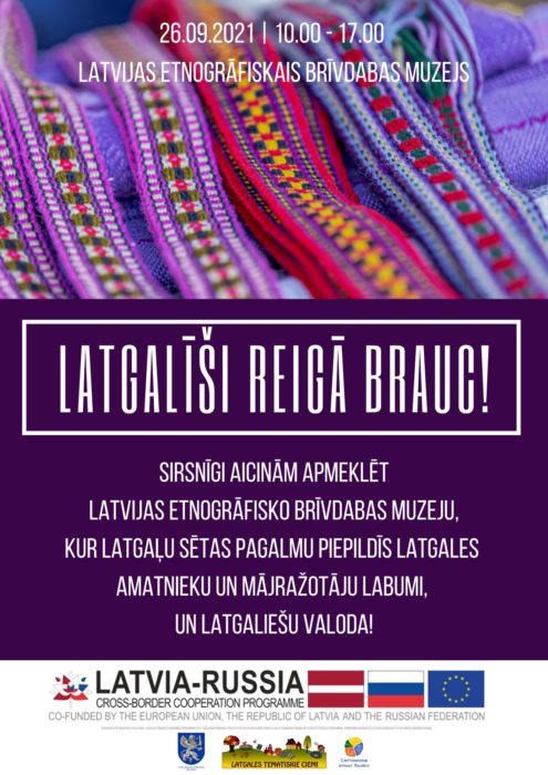 2021. gods 26. septembrī nu 10.00 da 17.00 stuņžu Reigā, Latvejis Etnografiskajā breivdobys muzejā, Latgolys plānuošonys regions sadarbeibā ar bīdreibu “Latgales Tematiskie ciemi” aicynoj iz latgalīšu ceļojūšu tiergu “Latgalīši Reigā brauc!”. Tiergs nūteik Latvejis-Krīvejis puorrūbežu sadarbeibys projektā “Amatniecība bez robežām”, informej Latgolys plānuošonys regiona Crafts projekta vadeituoja Natālija Kurakina.