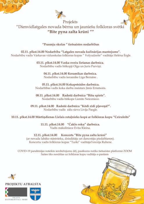 2.–12. novembrī aizvadeiti virtualī Dīnvydlatgolys nūvoda bārnu i jaunīšu folklorys svātki “Bite pyna zalta krūni”. Itī svātki beja plānuoti jau 2020. gods pavasarī, tok leidza ar strauju kovida izaplateišonu pasuokums tyka vairuokys reizis puorcalts iz cytu datumu, informej Dīnvydlatgolys nūvoda bārnu i jaunīšu folklorys kūpu koordinatore Anna Kārkle.