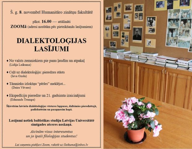 8. novembrī interesenti tyka aicynuoti iz Dialektologejis lasejumim tīšsaistē, kas ritēja baltistikys studeju Latvejis Universitatē symtgadis atceris nūskaņā. Taidi lasejumi nūteik kas gods Latvejis Universitatis Humanitarūs zynuotņu fakultatis Latvistikys i baltistikys nūdalis profesoris Lidejis Leikumys vadeibā i ir veļteiti izcyluos latvīšu volūdneicys, dialektologis i ilggadejuos LU profesoris Martys Rudzītis (04.11.1924–19.07.1996) pīmiņai, reizē – aplīcynuojums nūvodu runys izpietis nūzeimeigumam ari myusu dīnuos, cīna paruodeišona volūdys regionalūs paveidu saglobuotajim.
