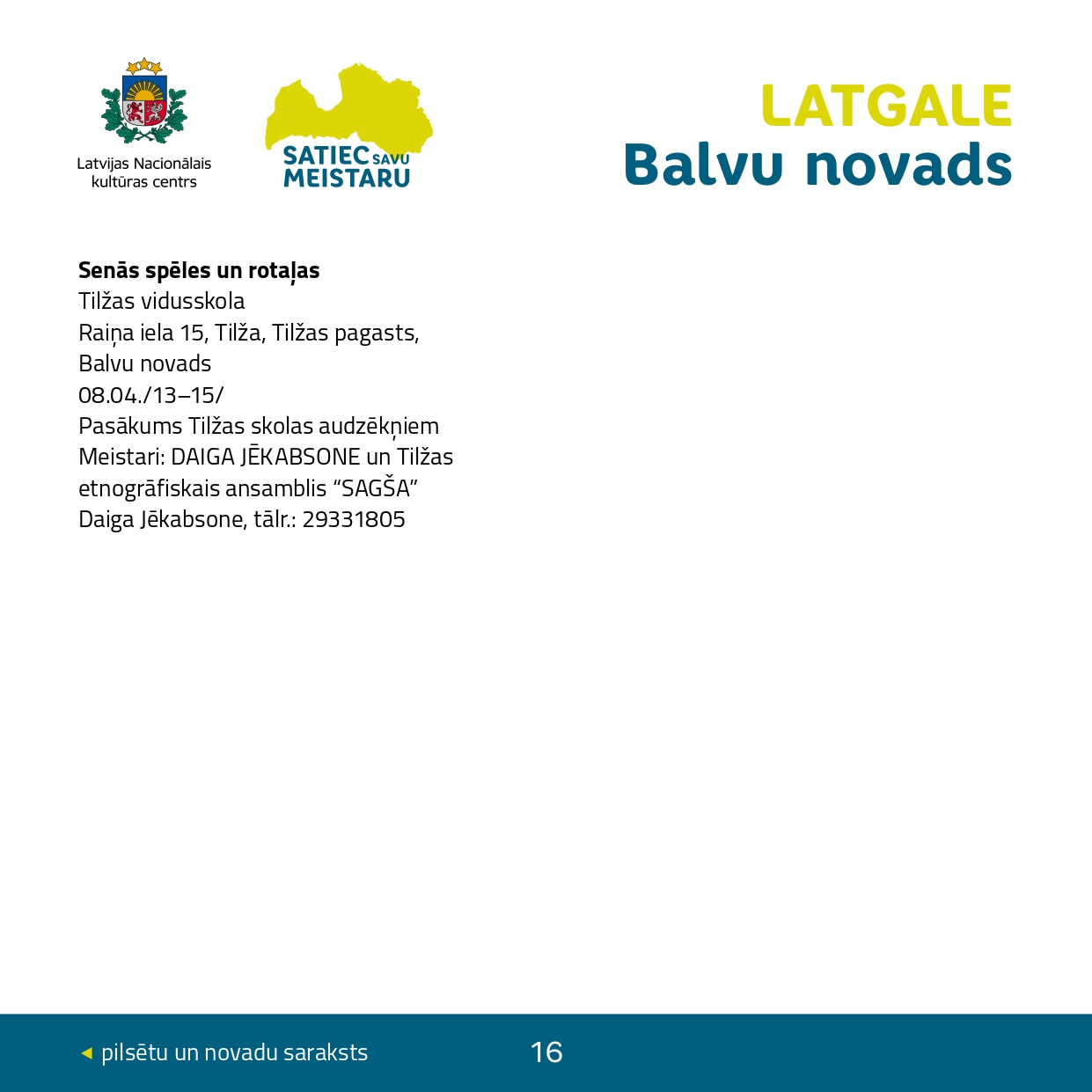 Latvejis namaterialuo kulturys montuojuma pasuokuma “Satiec savu meistaru” laikā kotram interesentam byus vareiba tikt pi prīškstota par vysaidom omotu prasmem, tautys tradicejom i tū, kai ituos tradicejis teik puormontuotys i pīlāguotys myusu dīnom. Tradiceju i omotu zynuošonys dūt vareibu na viņ pošam tuos izmontuot, tok ari nūviertēt cytu dorbu, atškiert meistaru dorbu i kvalitati.