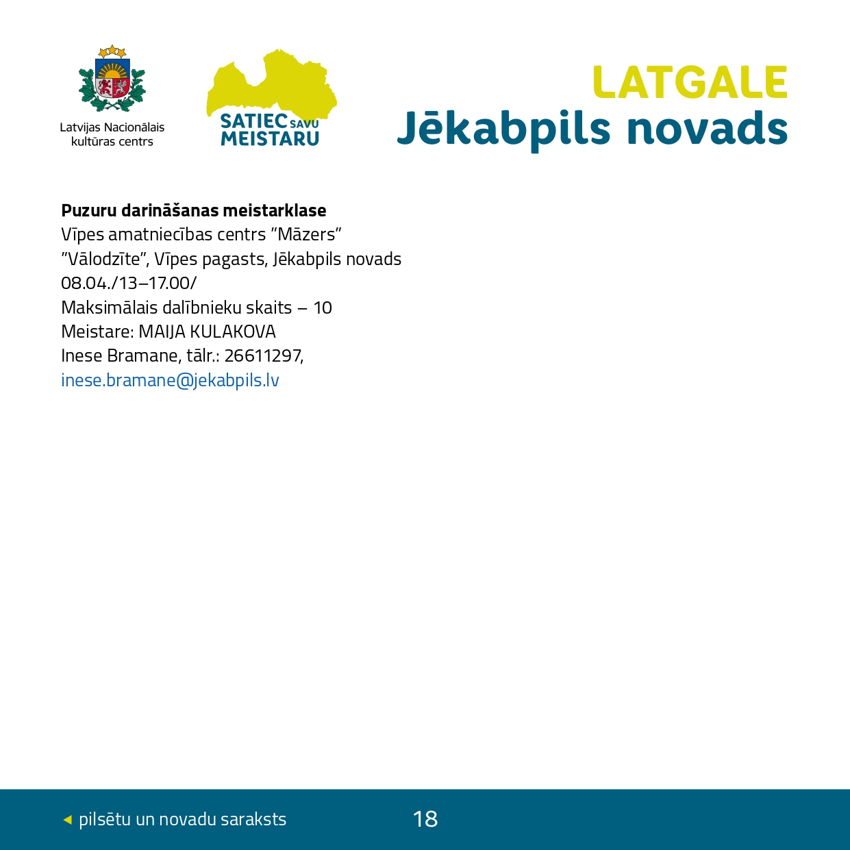 Pasuokumu “Satiec savu meistaru” organizej Latvejis Nacionaluos kulturys centrs sadarbeibā ar pošvaļdeibom vysā Latvejā.