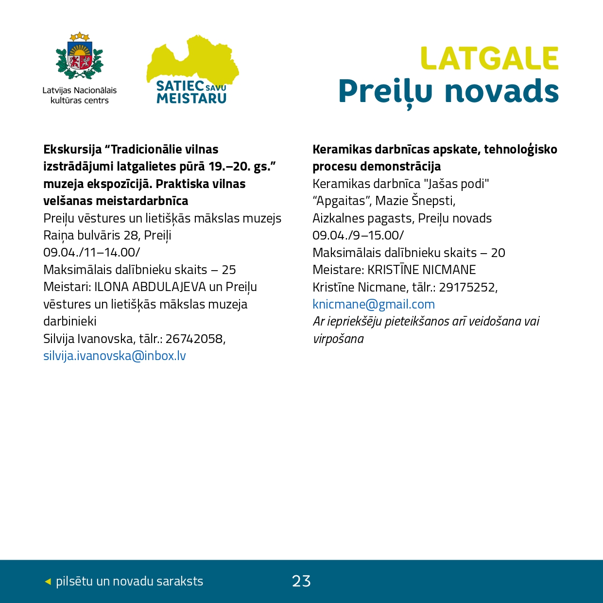 Latgolā byus vareiba īpazeit klugu peišonys, kūka amatnīceibys prasmis, greidys celeņu ausšonu stuovūs, ari voska sveču līšonys, puzuru taiseišonys i cytys prasmis. Taipoš byus vareiba īpazeit Latgolys kulinaruo montuojuma tradicejis, raugūt pagataveit putrys piec senejim receptim, gordus bleiņus i asuškys. Ar vysu programu var īsapazeit ITE.