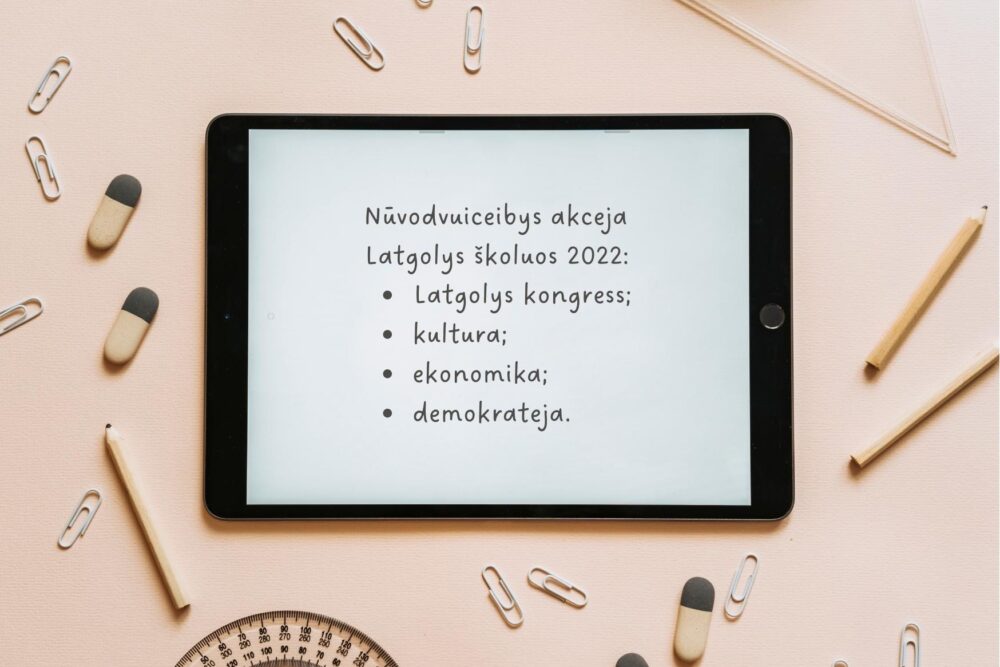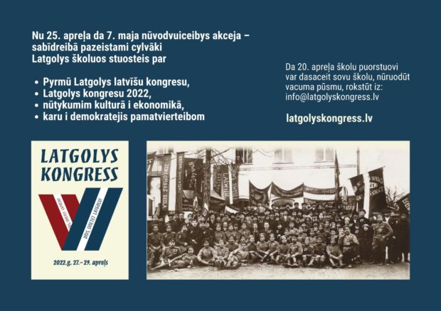 Sabīdreibā pazeistami cylvāki teik aicynuoti Latgolys školuos (kluotīnē ci attuolynuoti) nu 25. apreļa da 7. maja stuosteit par Latgolys latvīšu kongresu, aktualū Latgolys kongresu, nūtykumim kulturā i ekonomikā. Itamā reizē – ari par demokratejis pamatvierteibom, kurys tik dreiži var zaudēt Krīvejis izraiseituo kara i rašisma deļ, viestej nūvodvuiceibys akcejis rūsynuotuoja Ilga Šuplinska.
