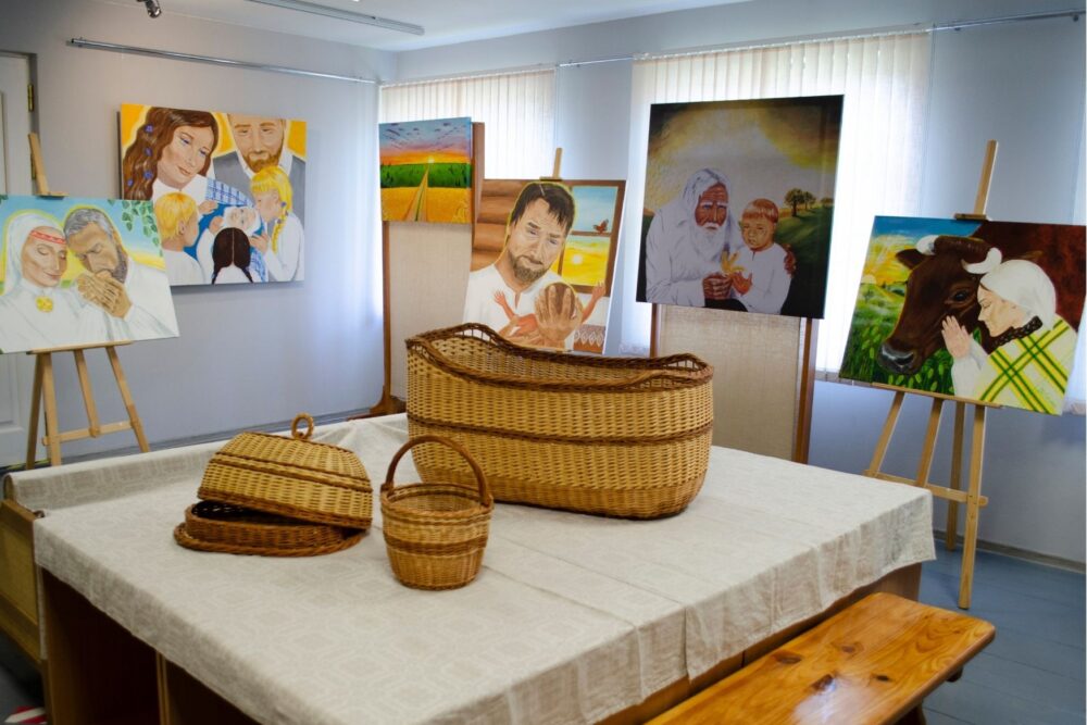 Izstuodē apsaveramys 10 gleznys ar spieceigu i emocionalu viestejumu, jau tūs nūsaukumi īlīk vuordūs izstuodis byuteibu: „Mīlestība. Mūžība”; „Ģimene. Nāc saimē”; „Maize. Ceļš”; „Sākotne”; „Mantojums”; „Barotāja”; „Cerība”; „Svētība”; „Pamats. Arājs”; „Daile”. Ekspoziceju papyldynoj muokslineicys veira Jura Gavara taiseitī klugu pynumi: šyupeļs, maizis kaste, skaline, kas simboliski papyldynoj i pastreipoj izstuodis ideju – montuojums.