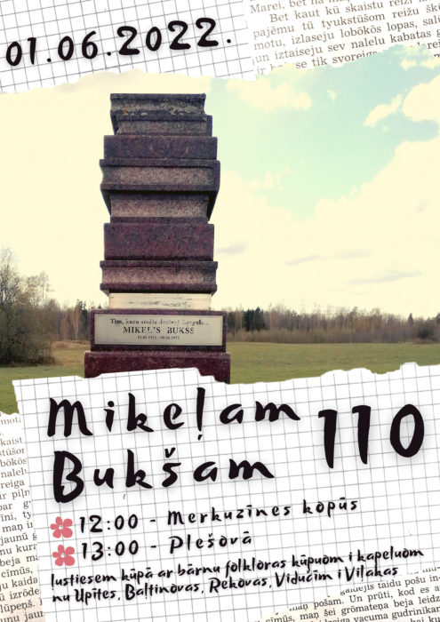 1. junī Mikeļa Bukša dzimšonys dīna tiks svieteita Bolvu nūvodā – pušdīnis laikā ar sasapuļciešonu pīminis šaļtei Baļtinovys pogosta Merkuzīnis kopūs, kur paglobuoti Bukša dzymdynuotuoji, nu vīnā stuņdē piec pušdīnu Škilbānu pogosta Plešovā pi Bukša dzymtuos sātys, kur byus svātku sasatikšona ar Upītis Baļtinovys, Rekovys, Viļakys i Viduču bārnu folklorys kūpom i kapelom.