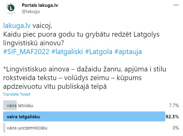 Apvaicojūt portala lakuga.lv skaiteituojus Facebook, Twitter i Instagram, var secynuot, ka portala skaiteituoji piec puora godu Latgolys lingvistiskū ainovu gryb redzēt vaira latgaliskuoku.