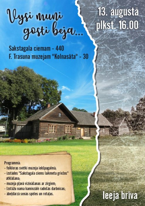 13. augustā 16.00 vysi teik aicynuoti iz F. Trasuna muzeju “Kolnasāta”, kur īškpogolmā byus svātku koncerts, kurā pīsadaleis Rēzeknis nūvoda folklorys kūpys, uzastuos “Dricānu Dominante” i atmiņuos par muzeja atkluošonu daleisīs kulturys darbineica Elīna Prusaka. Pasuokuma laikā tiks atkluota puorvītojamuo izstuode “Sakstagala ciems laikmeta griežos”, kurys veiduošonā izmontuoti muzeja kruojuma materiali i viesturnīka Agra Dzeņa pietejumi par Sakstagolu. Prezentēs ari atkluotņu komplektu “F. Trasuns un viņa laikabiedri”.