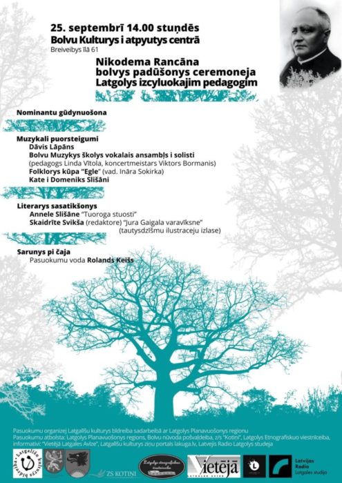 Svātdiņ, 25. septembrī, Bolvu Kulturys i atpyutys centrā, īsuocūt Školuotuoju dīnys sviniešonu i gūdynojūt vīnu nu izcyluokūs školuotuoju Nikodemu Rancānu, nūtiks Nikodema Rancāna bolvys Latgolys izcyluokajim pedagogim padūšonys ceremoneja. Itūgod bolvai dasaceiti 14 pretendenti nu Rēzeknis vaļstpiļsātys i Rēzeknis nūvoda, Bolvu nūvoda, Kruoslovys nūvoda i Daugovpiļs vaļstspiļsātys, informej bolvys reikuotuoju puorstuove Ilga Šuplinska.