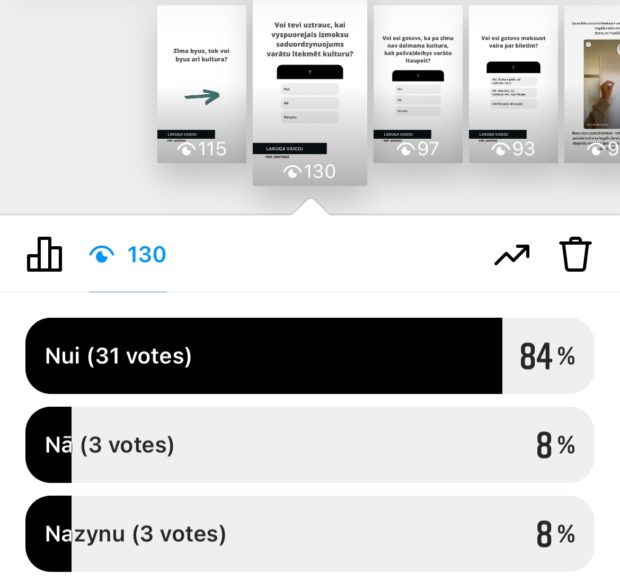 Lakuga.lv ari apvaicuoja sovus sekuotuojus socialūs teiklu kontūs Twitter, Facebook i Instagram. Aptaujis mierkis beja izprast, cik Lakuga.lv sekuotuojim ir svareiga īspieja regulari apmeklēt kulturys nūtikšonys. Aptauja paruodeja, ka vairumam ļaužu vystik koč drupeit satrauc vysu izmoksu saduordzynuojuma ītekme iz kulturys dzeivis nūtikšonom.