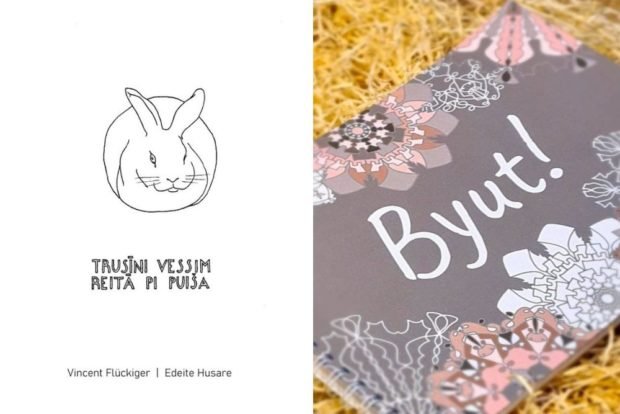 Diveji muokslys dorbi vīnā – tai grybātūs saukt Edeitis Husaris pīraksteitū i Vinsenta Flikigera sazeimātū gruomateņu “Trusīni vessim reitā pi puiša”. Vysapyrma beja latvyski i drupeit ari latgaliski runojūšuo šveicīšu muokslinīka Vinsenta zeimiejumi ar vysaiduokom Latgolys aineņom. Nu tūs Edeite pīraksteja nalelus stuosteņus par myusu dīnu Latgolu, kurūs saplyust kai juos, tai Vinsenta pīredze. Nalelais apjūms i tulkuojumi angļu i vuocu volūdā dūd vareibu itam izdavumam byut ari par, pīmāram, pyrmū sūli iz skaiteišonu latgaliski. Tok, ka ari itys ruodīs par daudz, latgalīšu volūdu var raudzeit īpazeit kruosojamā mandalu gruomotā “Byut!”. Tī var atrast na tik mandalys, bet ari tūs autoris Kristiānys Rancānis citatus i atzinis par vierteibom latgaliski.